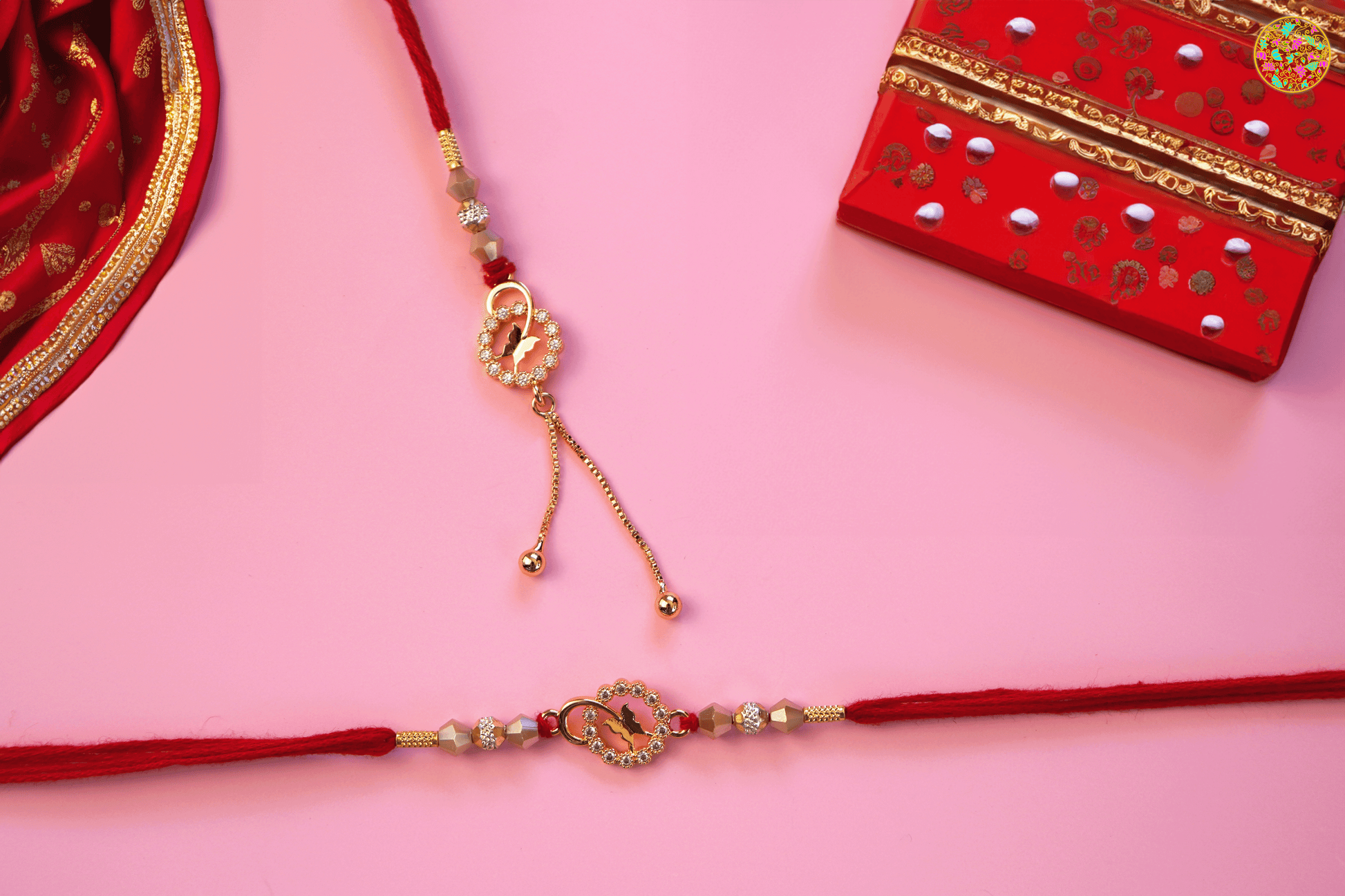 Add some cute charm to your Rakhi celebration with our Bhai Bhabhi Cute Butterfly Rakhi Set. This golden Rakhi set features a unique butterfly design with a red thread, perfect for hanging on your wrist (and your Bhabhi's wrist too)! How adorable!