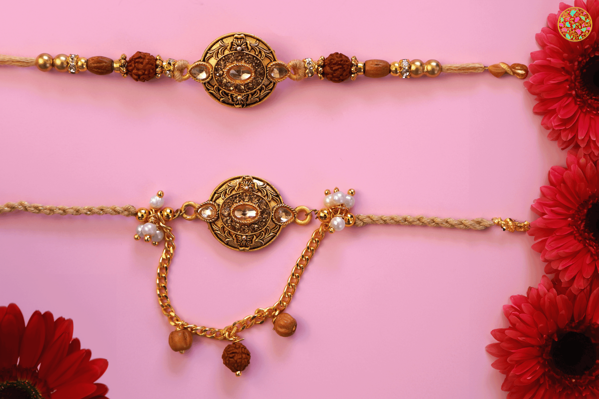 Protect your bond with this Bhai Bhabhi Evil Eye Rakhi Set. The golden and traditional design makes it truly unique. Bring double the luck with this set!