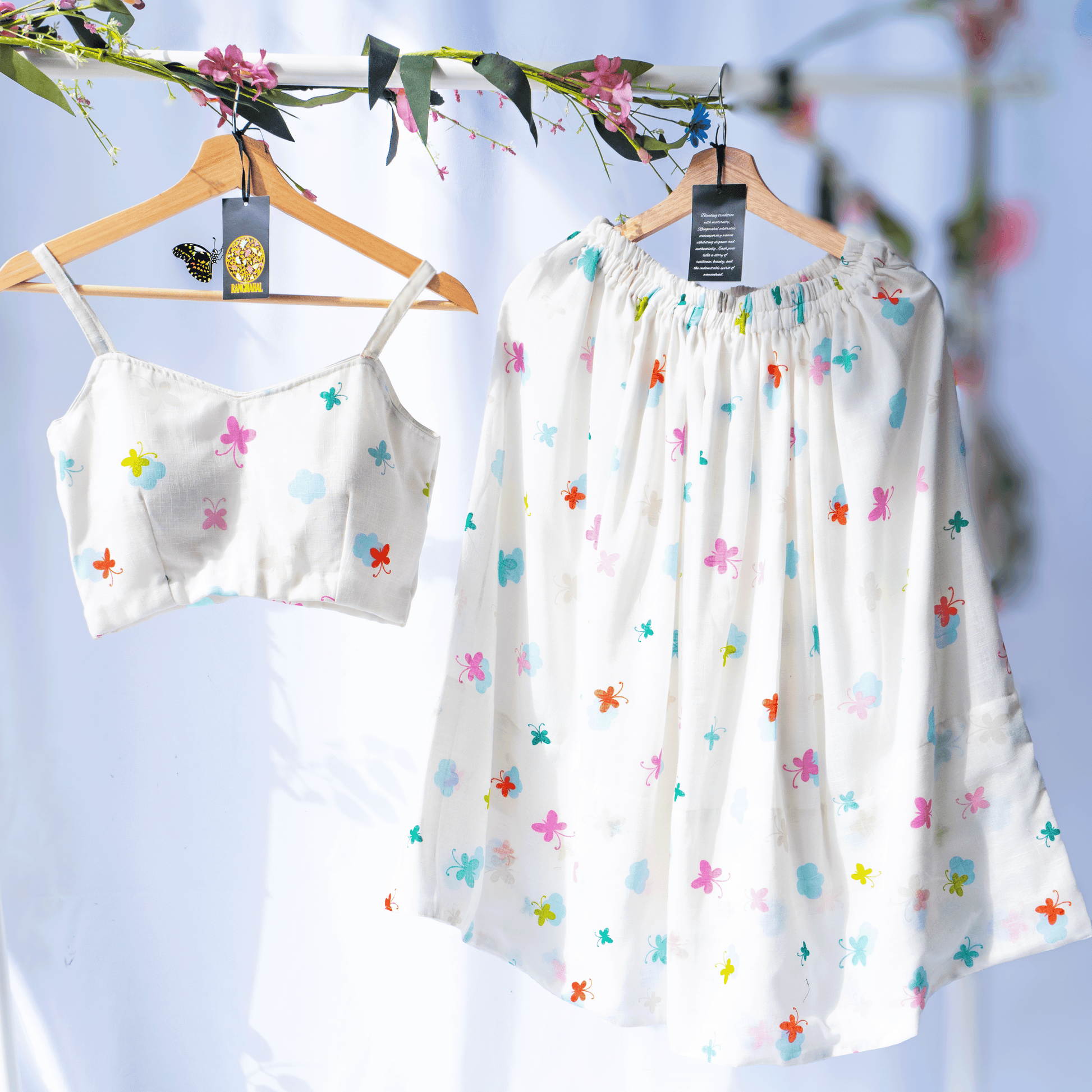 Add a touch of elegance to your wardrobe with our Butterfly Crop Top and Skirt Set in White. This super cute Indo-western set is perfect for any occasion, from parties to lunch outings. Stand out from the crowd with its unique butterfly design.
