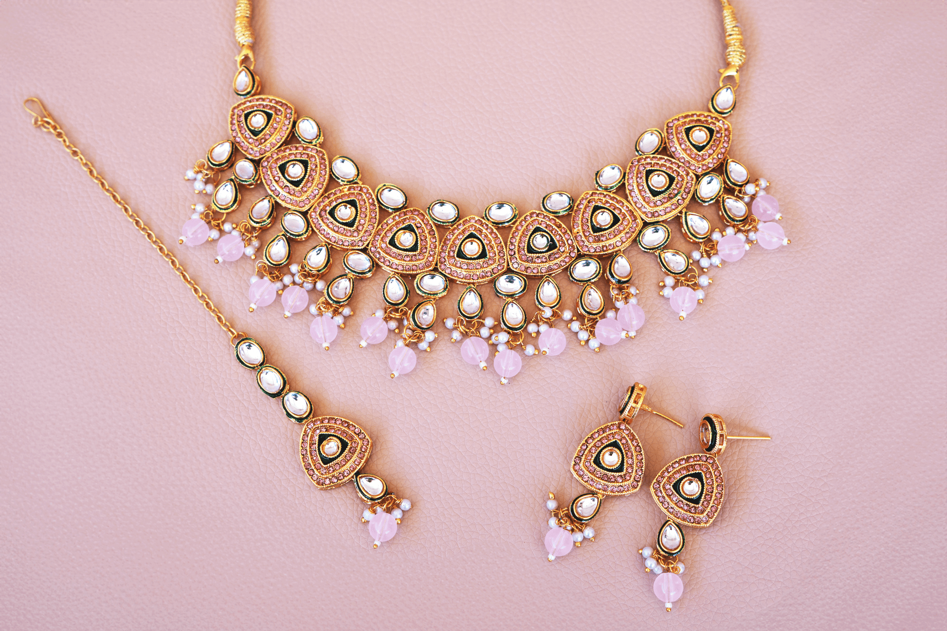Add a pop of pink with our Classic Kundan Choker Set! This set features a triangular-shaped choker, along with a matching maang tika and earrings for a complete look. The cute pink drops add a touch of playfulness to this elegant piece. (Seriously, it's so cute!)