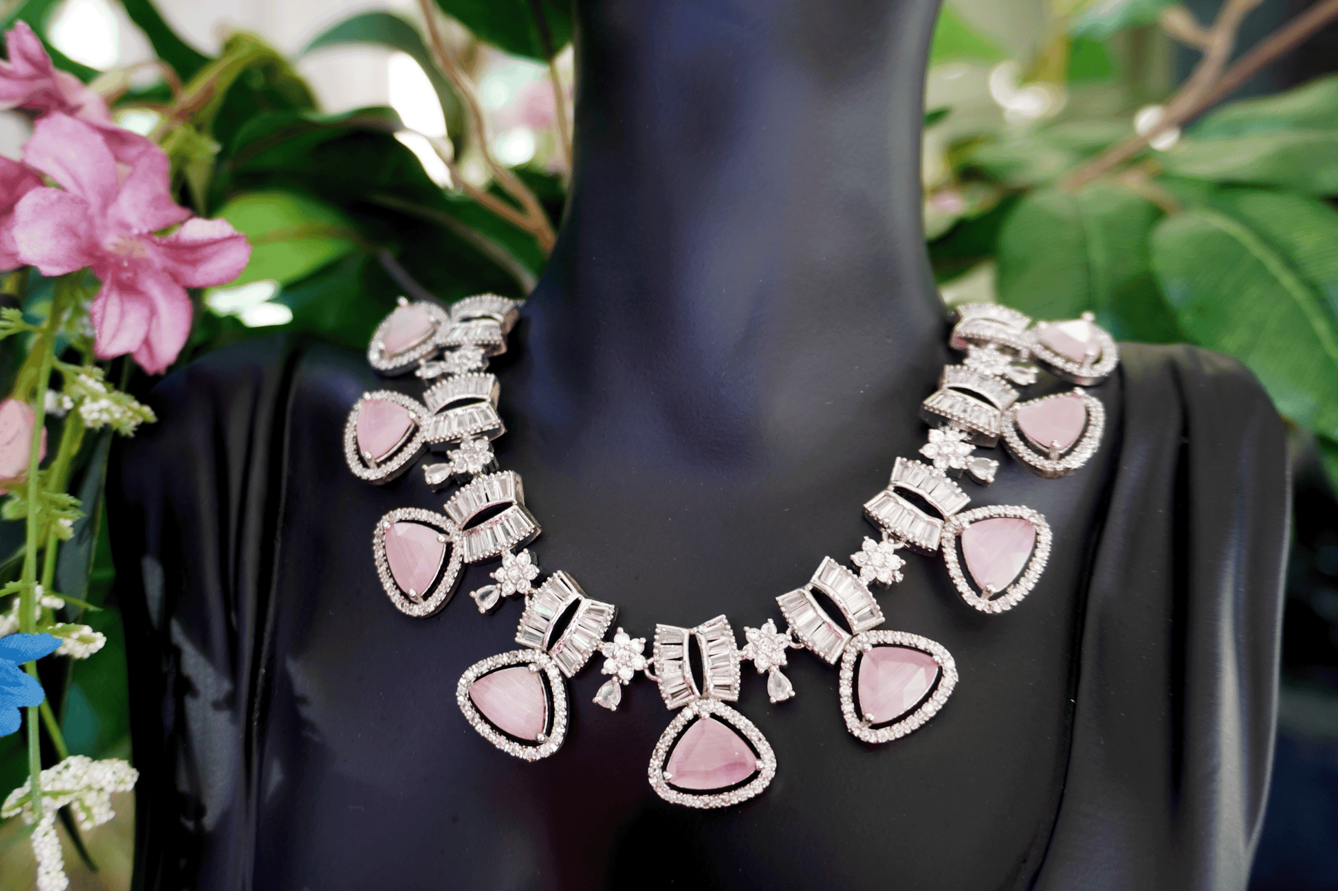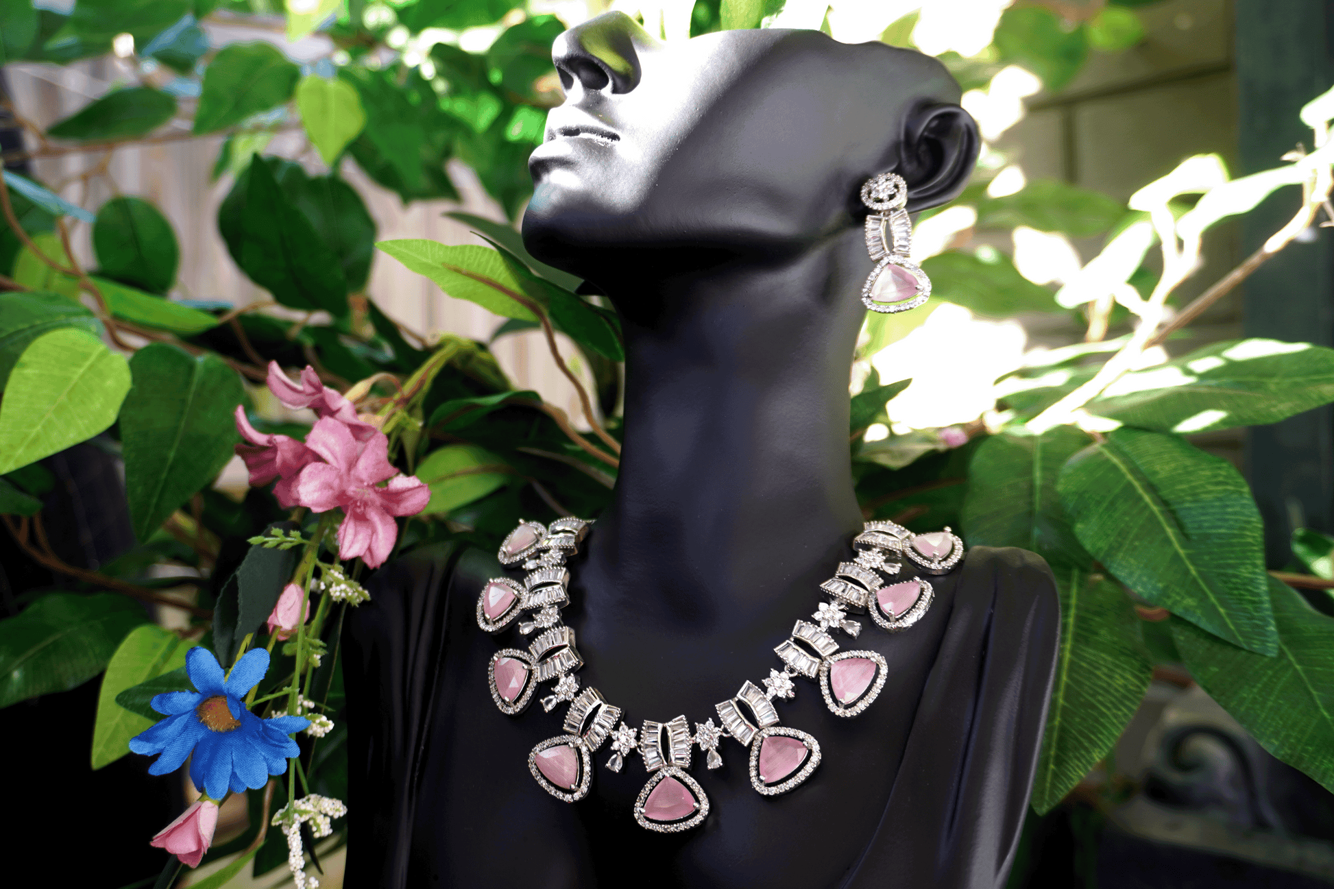This elegant Crystal AD Necklace Set adds a touch of sophistication to any outfit. The soft pink crystals shine brightly, while the intricate design showcases your style. Made with high-quality materials, this set is a must-have for any fashion-forward individual. Elevate your look with this timeless accessory.