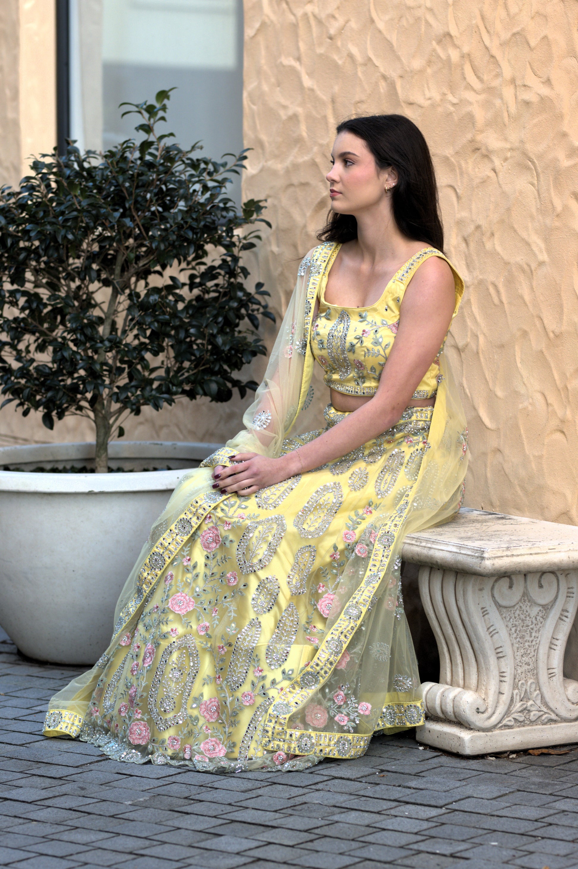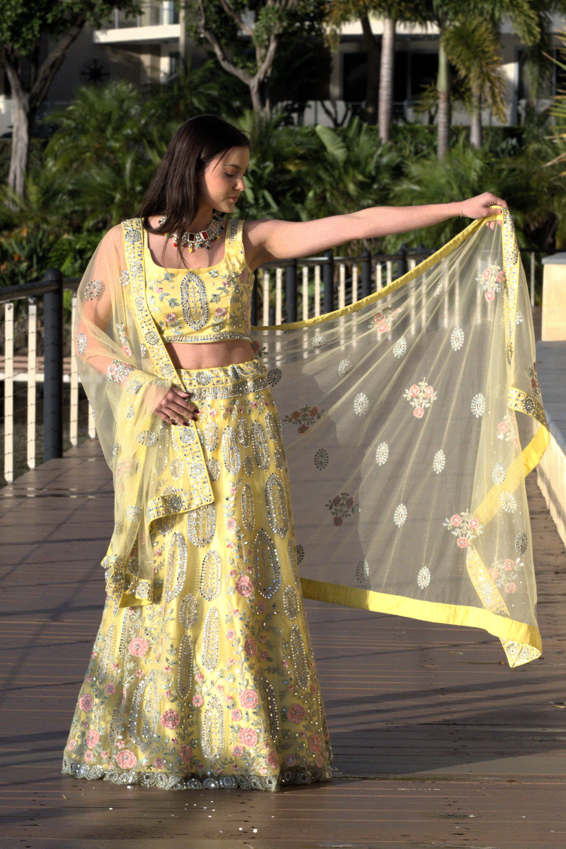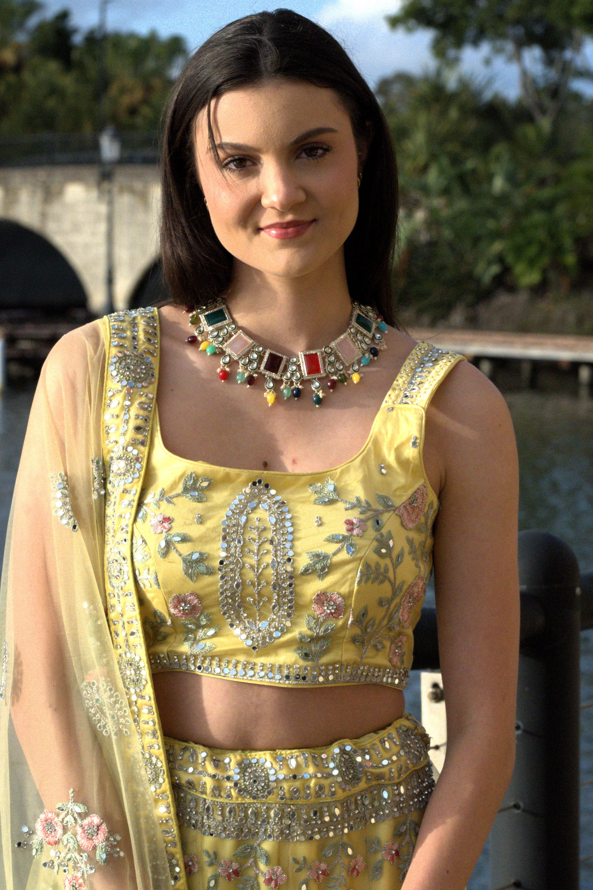 Dreamy Multicolor Floral Mirror Lehenga Set - Lemon Yellow