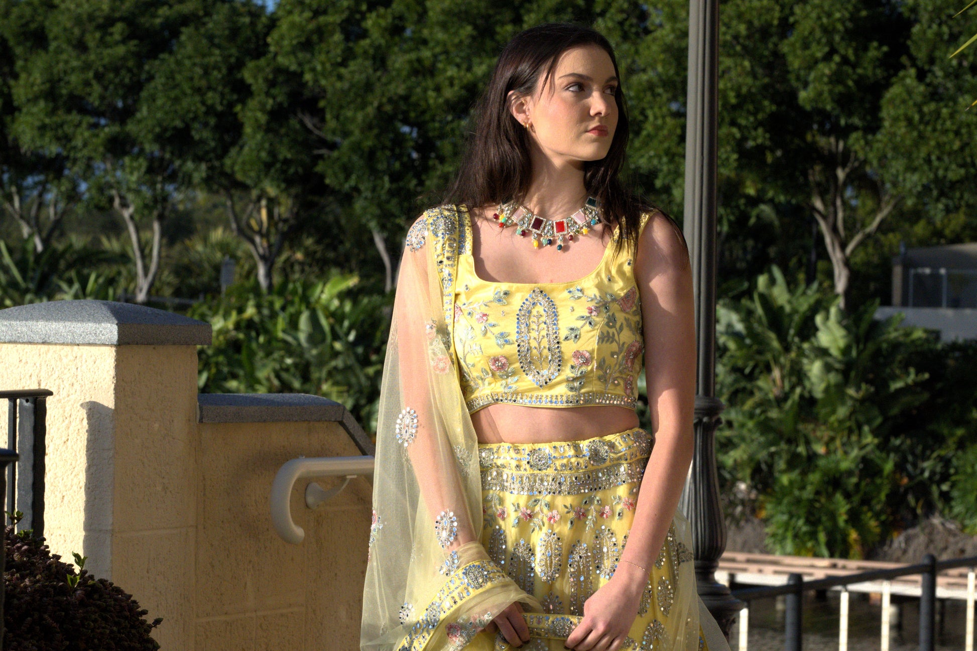 This elegant Dreamy Multicolor Floral Mirror Lehenga Set is perfect for any Indian function, Haldi ceremony, Mehndi celebration, Diwali gathering, or Garba event. Its vibrant multicolor design and lemon-yellow hue will surely make you stand out. Made with high-quality materials, it is a dreamy outfit that will make you feel like royalty.