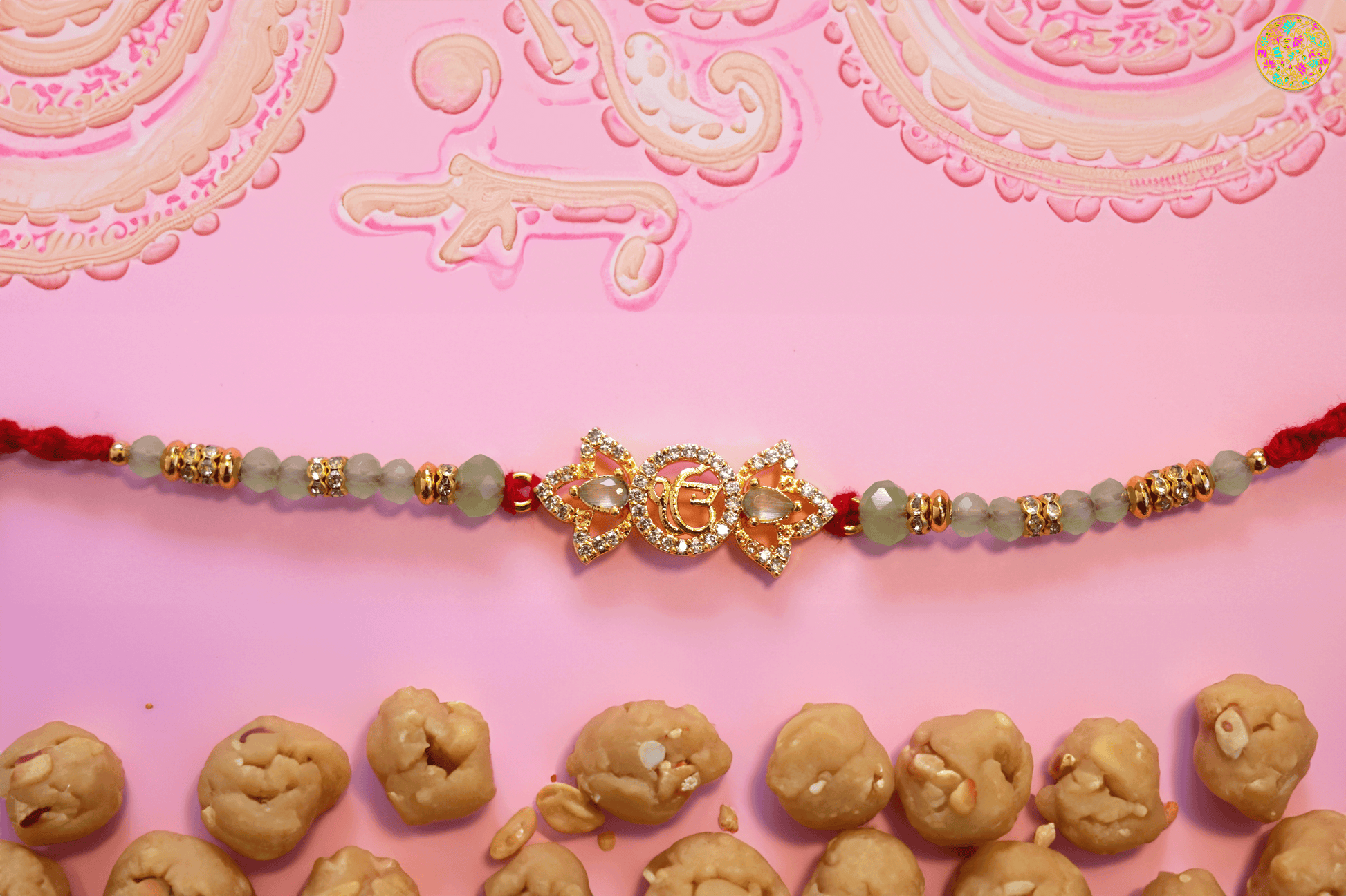 Add a touch of tradition with a modern twist to your Rakhi celebrations! The Ek Onkar Traditional Rakhi features a golden design embellished with pastel green beads. Perfect for siblings who appreciate both heritage and style.