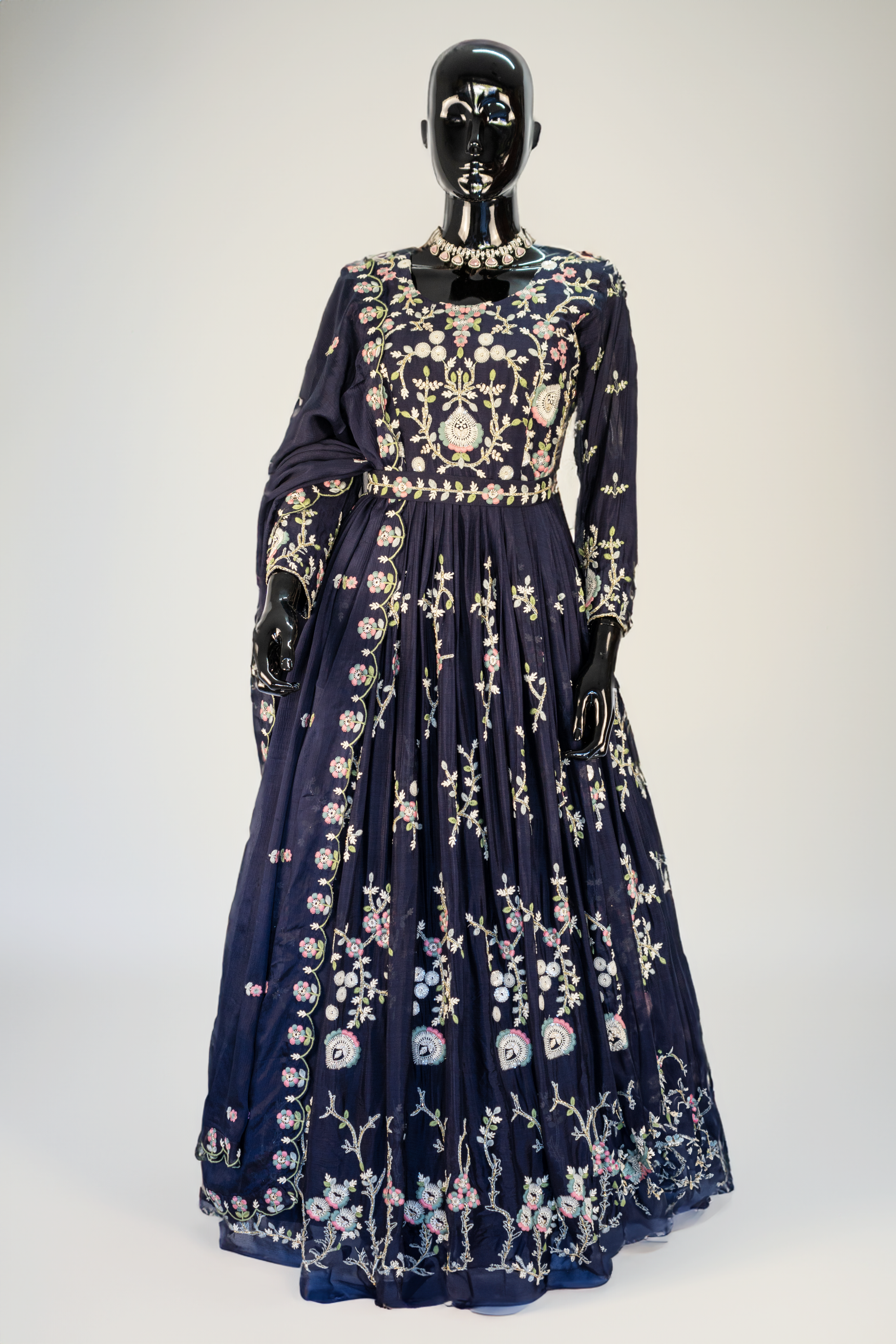 Rock this embroidered Anarkali suit in deep blue for a playful touch to your wardrobe. With intricate embroidery details, this suit is perfect for a quirky and fun look. Add some flair to your outfit with this unique piece. (And did we mention it's in a stunning deep blue? How chic!)