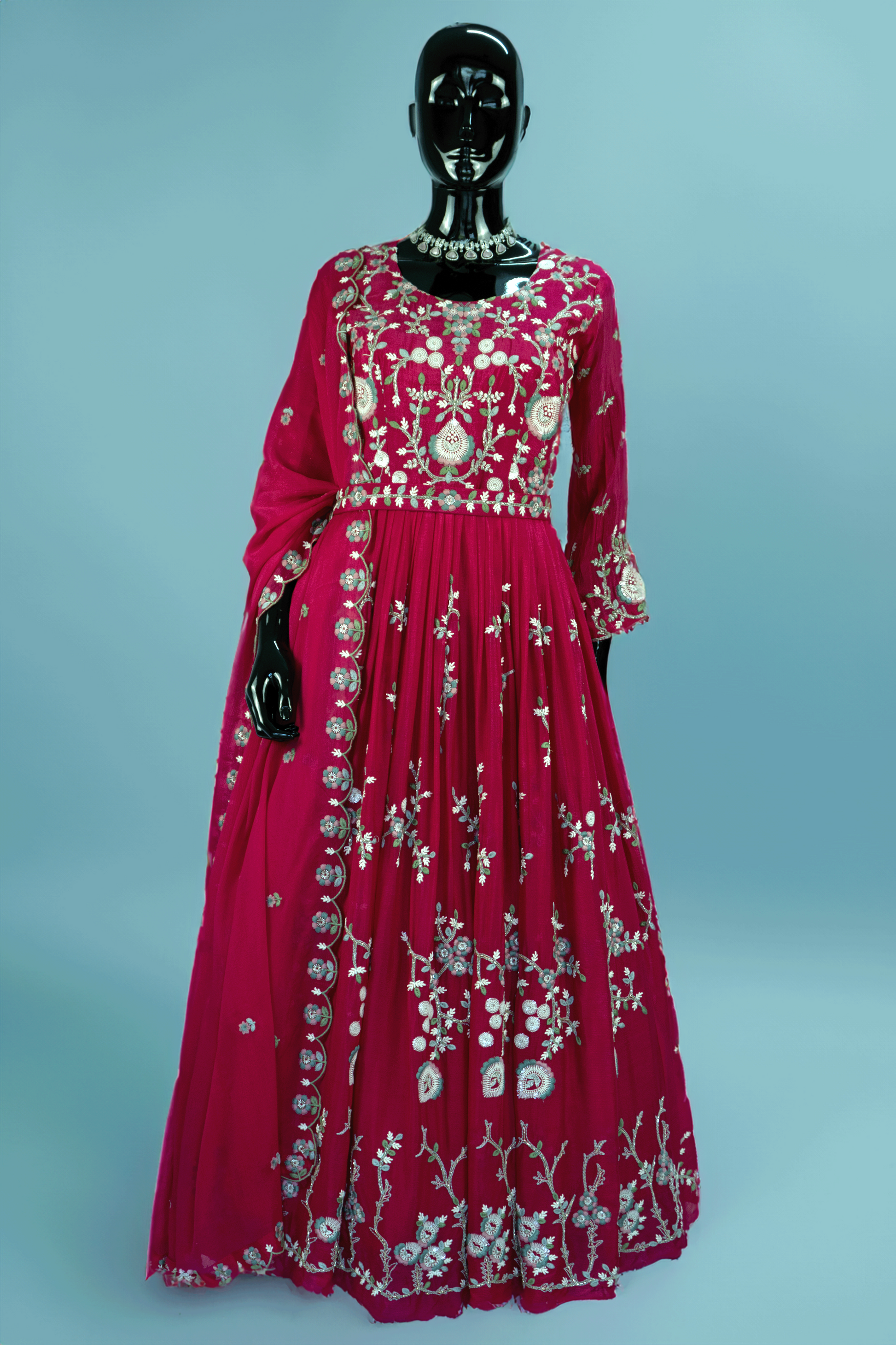 Rock this hot pink Embroidered Anarkali Suit and stand out from the crowd! The intricate embroidery adds a touch of elegance while the vibrant color adds a fun twist. Perfect for any occasion, this suit will surely make heads turn. (No one will ever call you basic in this gorgeous number!)