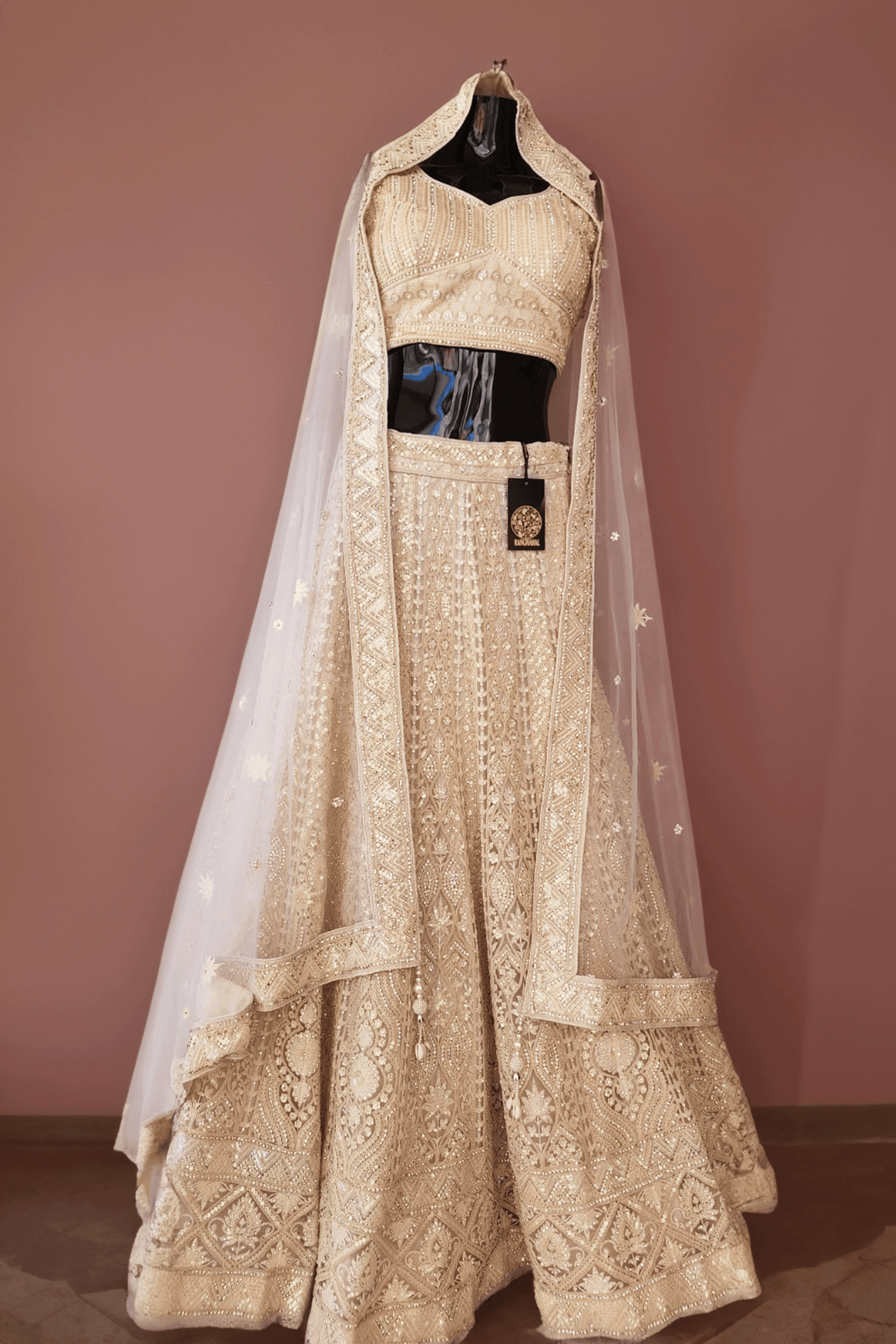 Embrace the opulence of our Ivory White Embroidered Lehenga Set. Adorned with intricate embroidery, sparkling rhinestones, and delicate threadwork, this elegant design is perfect for any party or occasion. Inspired by Mughal architecture, the heavy work and adjustable dori blouse add a touch of luxury to this exclusive piece.