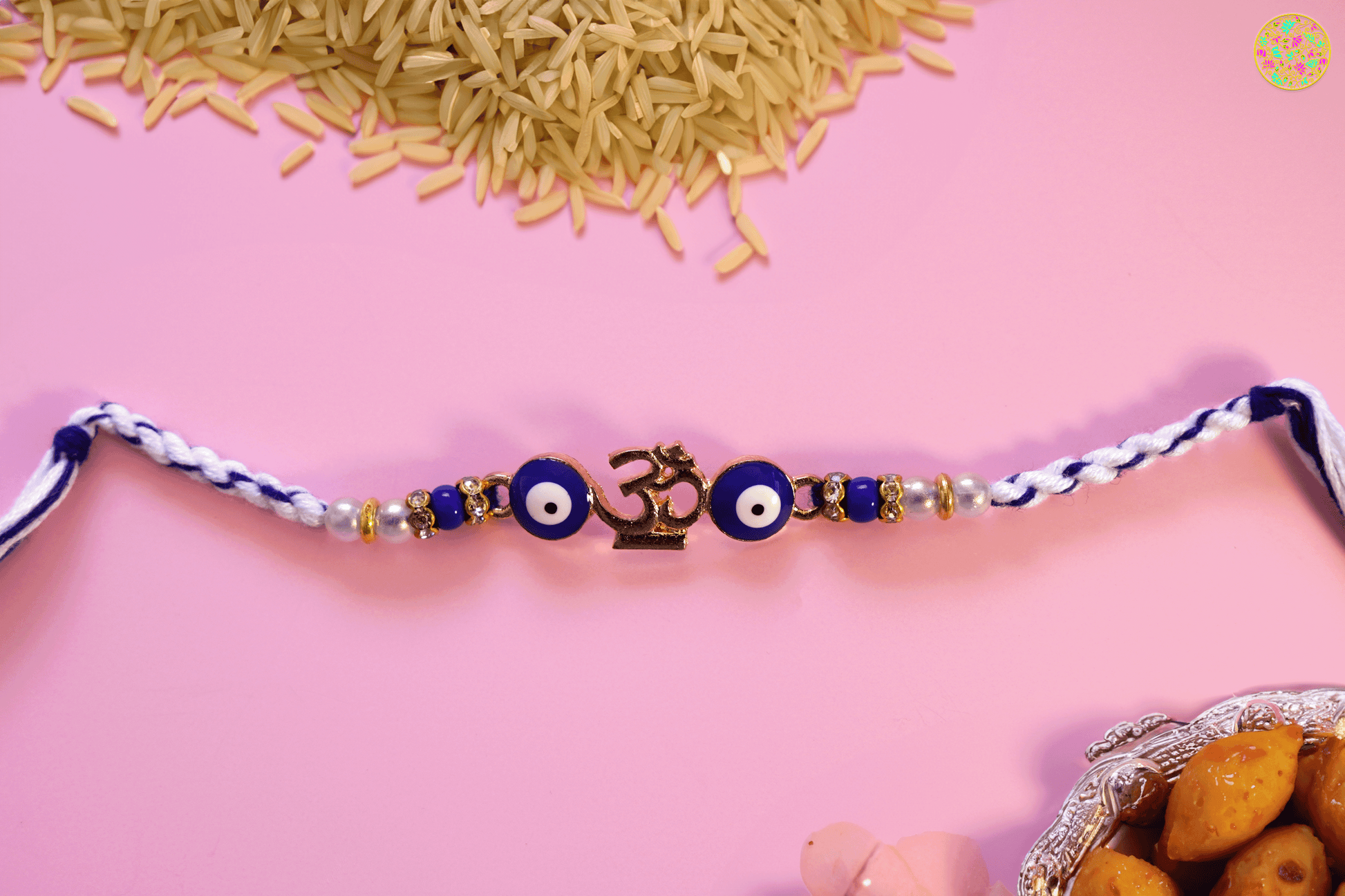 Protect your loved one from bad vibes with our Evil Eye Om Rakhi in blue. The classic evil eye design wards off negative energy while the Om symbol invokes peace and positivity. Give a unique and playful twist to your Raksha Bandhan celebration!