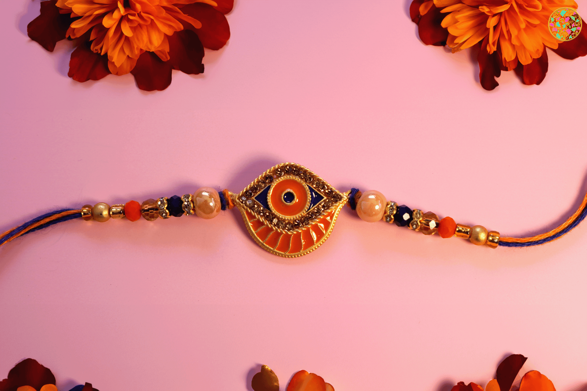 Protect your loved one with our Evil Eye Rakhi in orange. This cute and elegant piece is not your typical Rakhi. It's a unique and traditional statement piece that will surely keep the evil eye away. (No need to call Ghostbusters!)