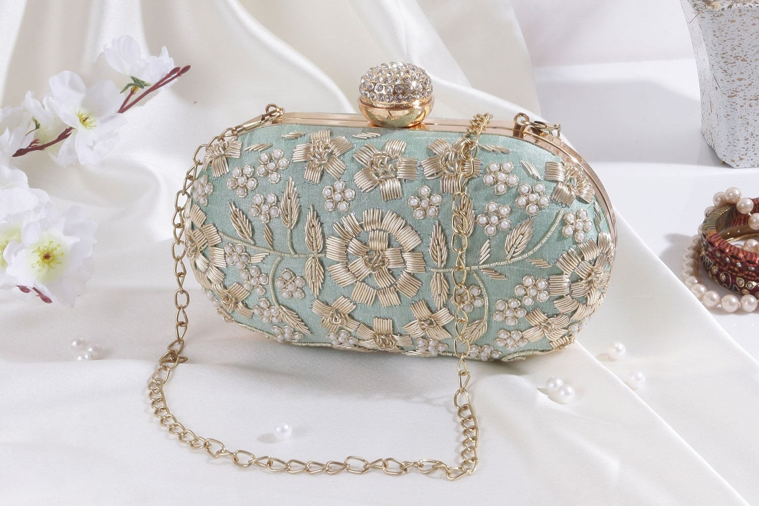 Introducing the Golden Bloom Bag in Mint Green. Inspired by the intricate golden floral embroidery and luxurious beadwork, this bag exudes femininity and luxury. Its mint green colour is both soothing to the eye and perfect for pairing with cute outfits. Add a touch of elegance to your wardrobe with this must-have accessory.