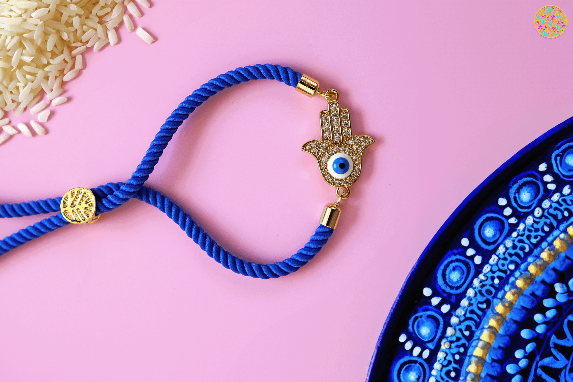 Impress your loved ones with this Hand Evil Eye Embellished bracelet in a bold blue color! The intricate design and protective evil eye charm make it a unique and meaningful gift. Show your playful side and celebrate this special bond with a touch of quirkiness.