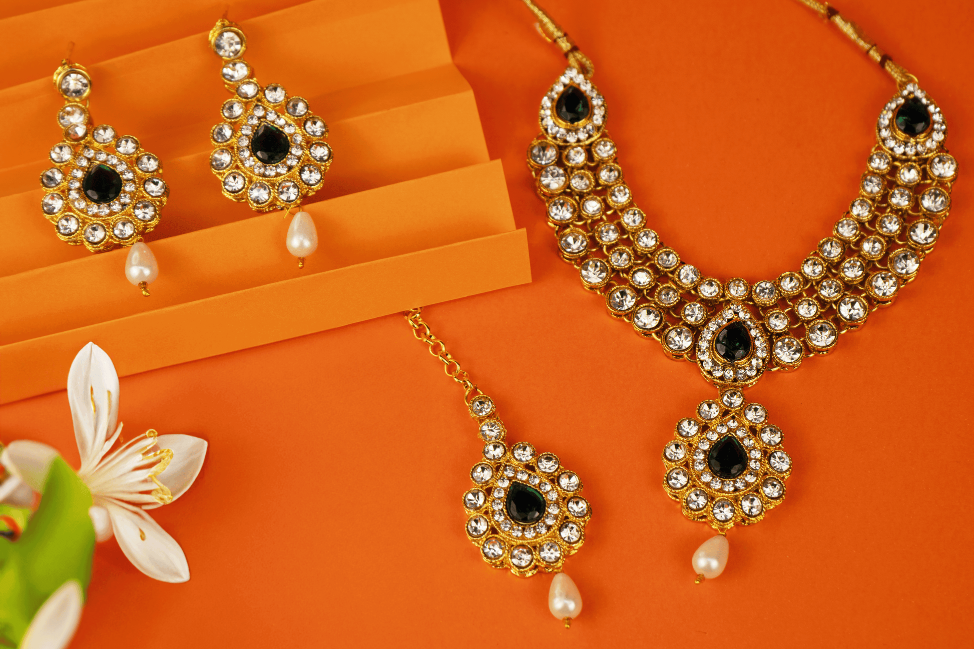 Add a pop of color to your look with our Kundan Necklace Set in green pendant. Made with delicate Kundan detailing, this set is perfect for adding a touch of glamour to any outfit. Upgrade your accessory game with this playful and stylish piece.