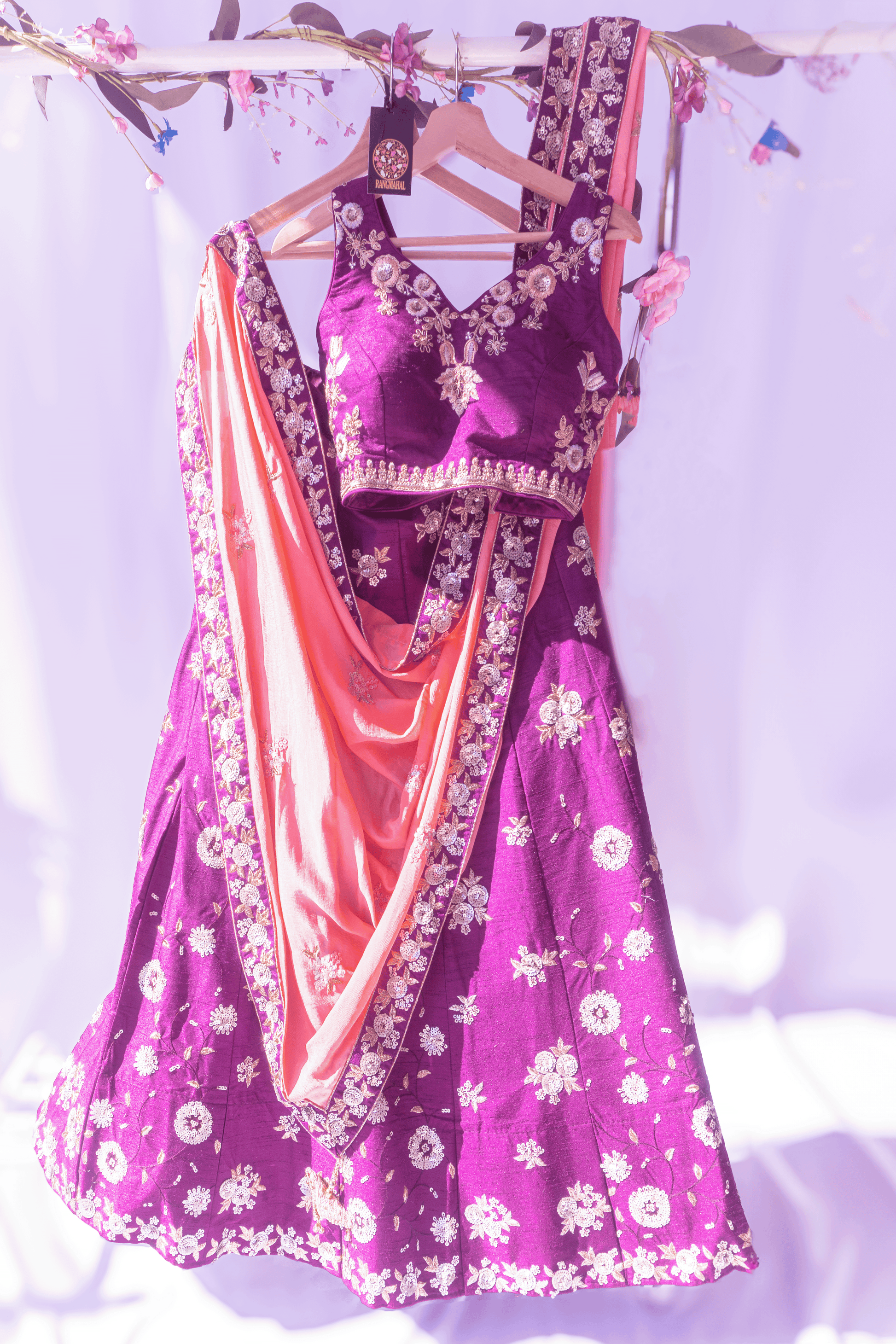 This traditional Lehenga Set features elegant Zari and Gota Patti work in bold purple and orange hues. Its stylish design and vibrant color pop make it perfect for special occasions. Add a touch of culture and sophistication to your wardrobe with this stunning piece.
