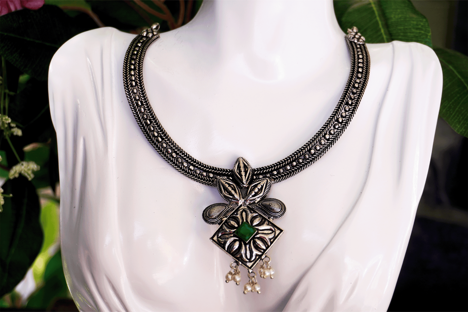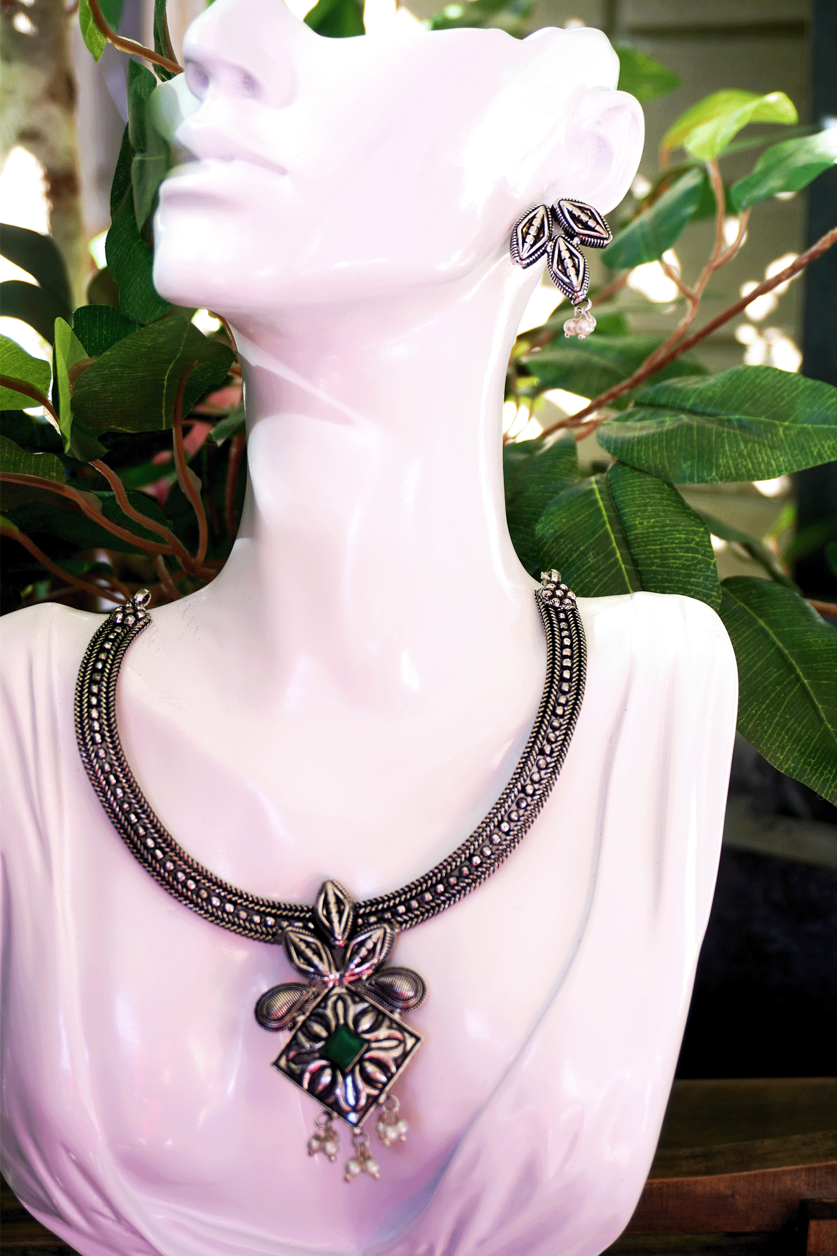Get ready to stand out from the crowd with our bold and chic oxidised necklace in a striking shade of green. This trendy and light accessory is the perfect addition to any outfit. Shine bright and make a statement with our Oxidised Necklace in Green.