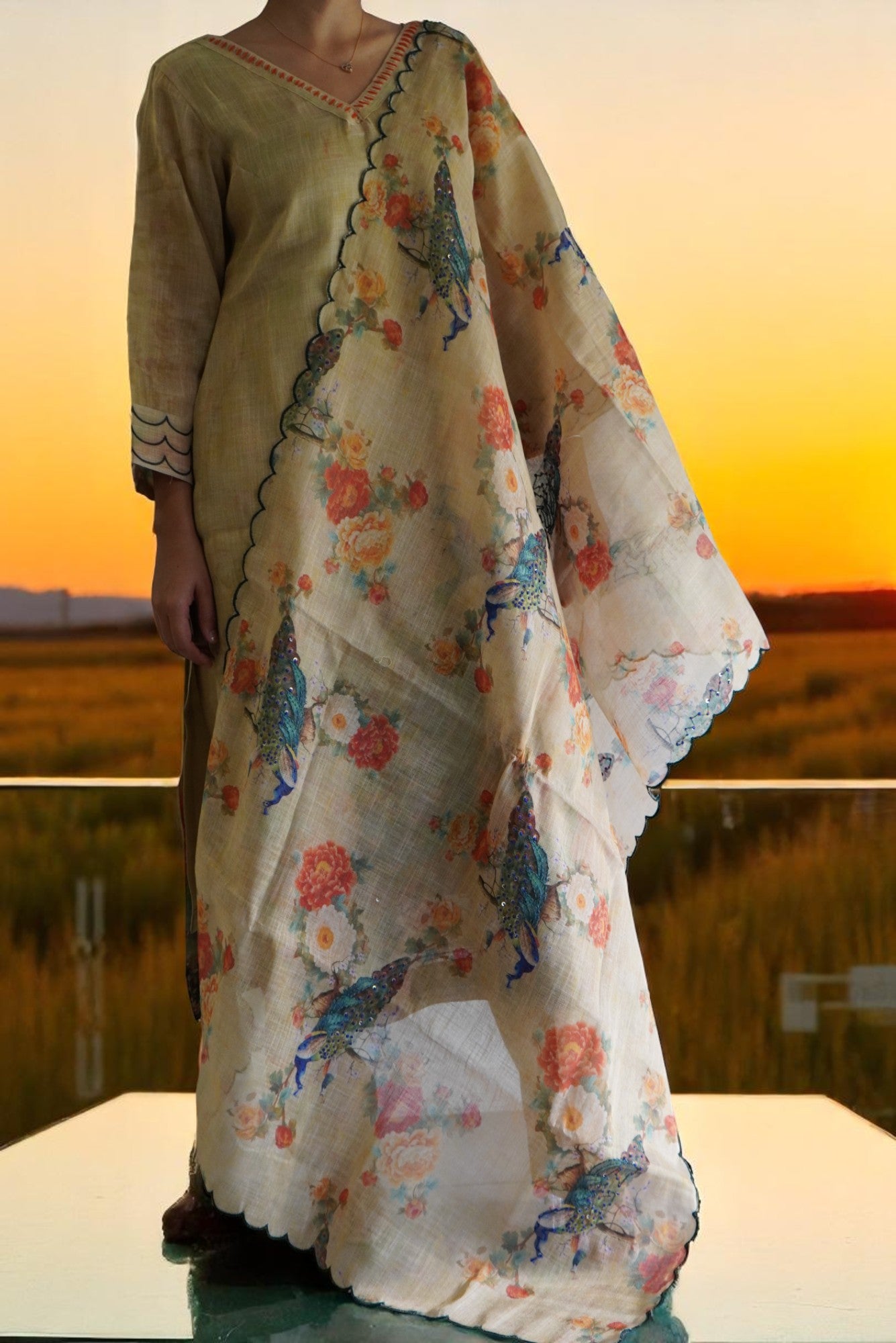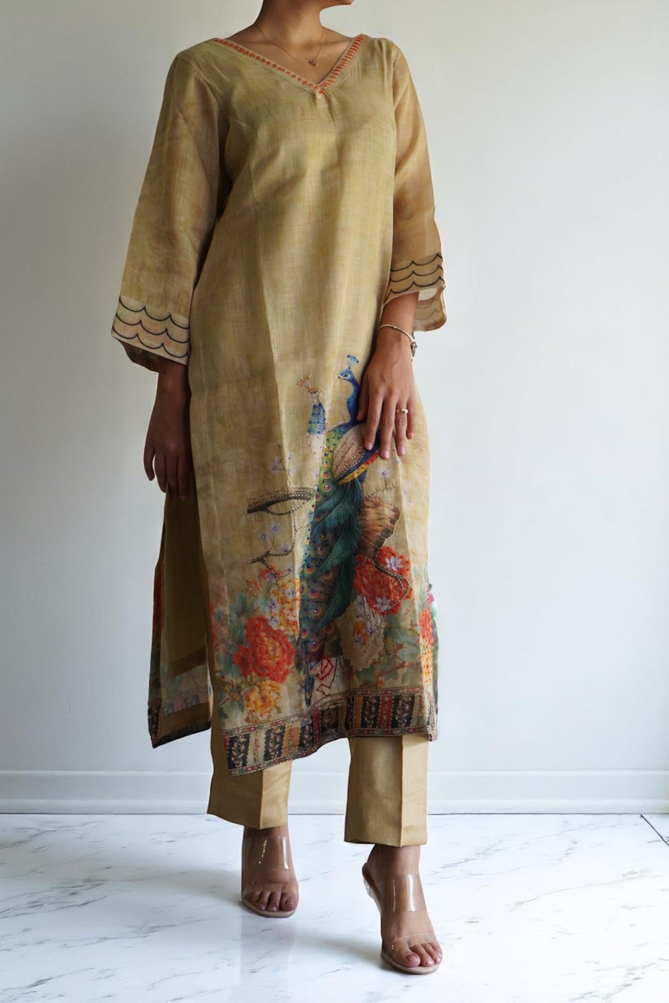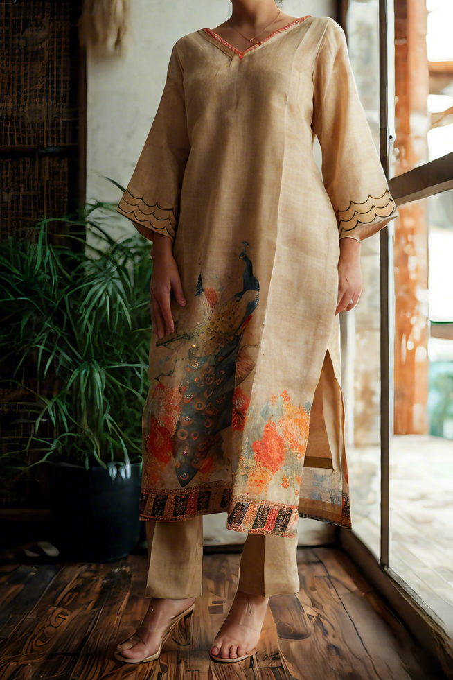 Elevate your wardrobe with this elegant peacock-designed pant suit, meticulously stitched for a flawless fit. The stylish crop top adds a modern touch, perfectly balancing sophistication and trendiness. Ideal for making a lasting impression, this suit combines unique design with comfort, ensuring you stand out with confidence at any event.