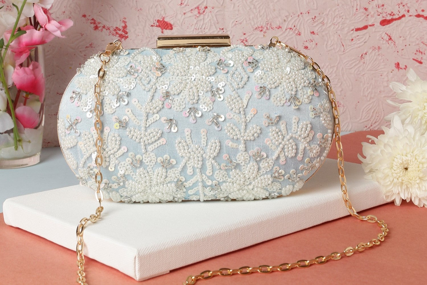 Experience pure luxury with Pearl Radiance - Pastel Blue. This dreamy bag reflects the shimmering sequins and radiant pearls that adorn it, adding a touch of femininity and cuteness to your ensemble. Elevate your style with this stunning and sophisticated accessory.