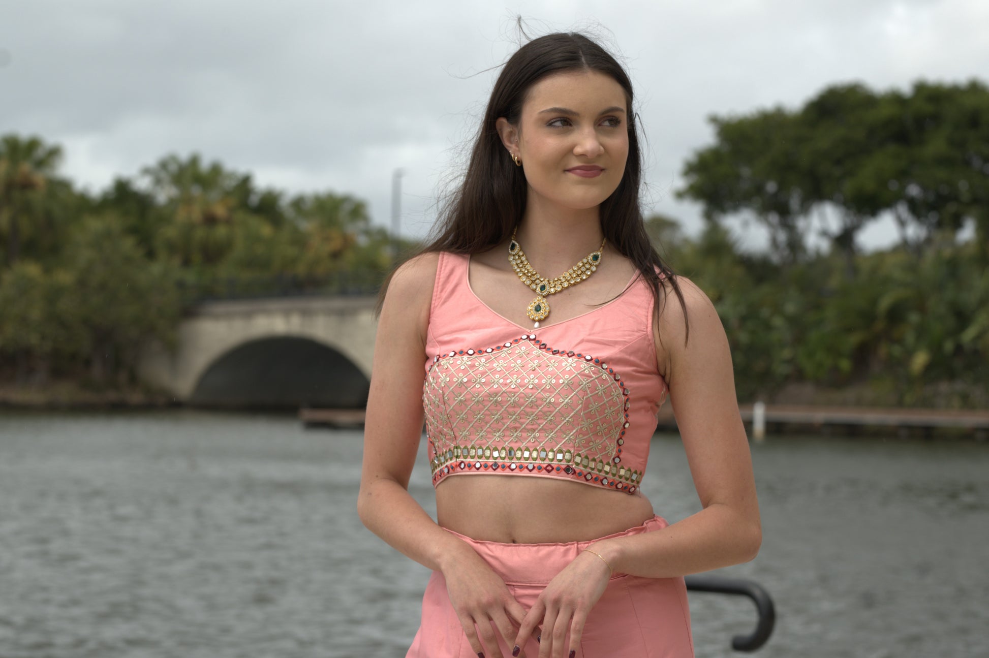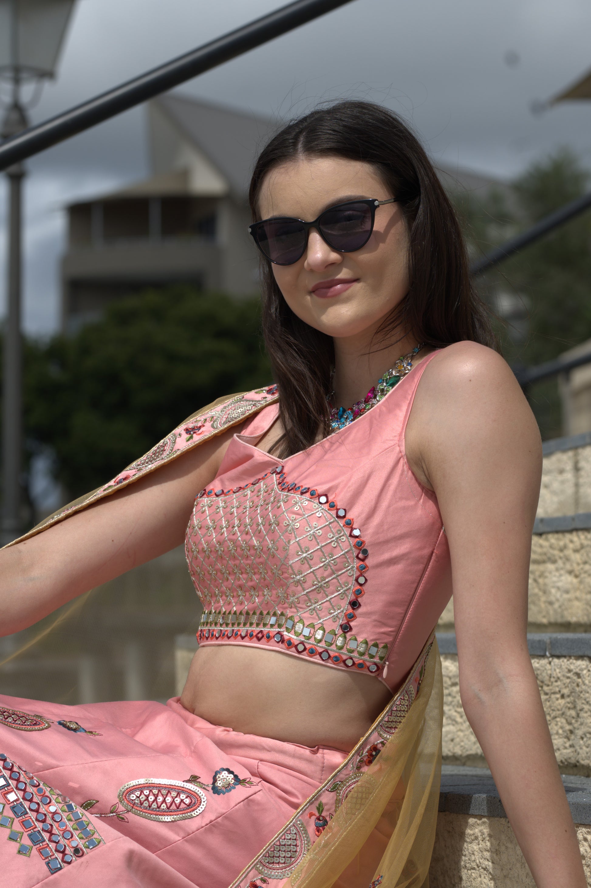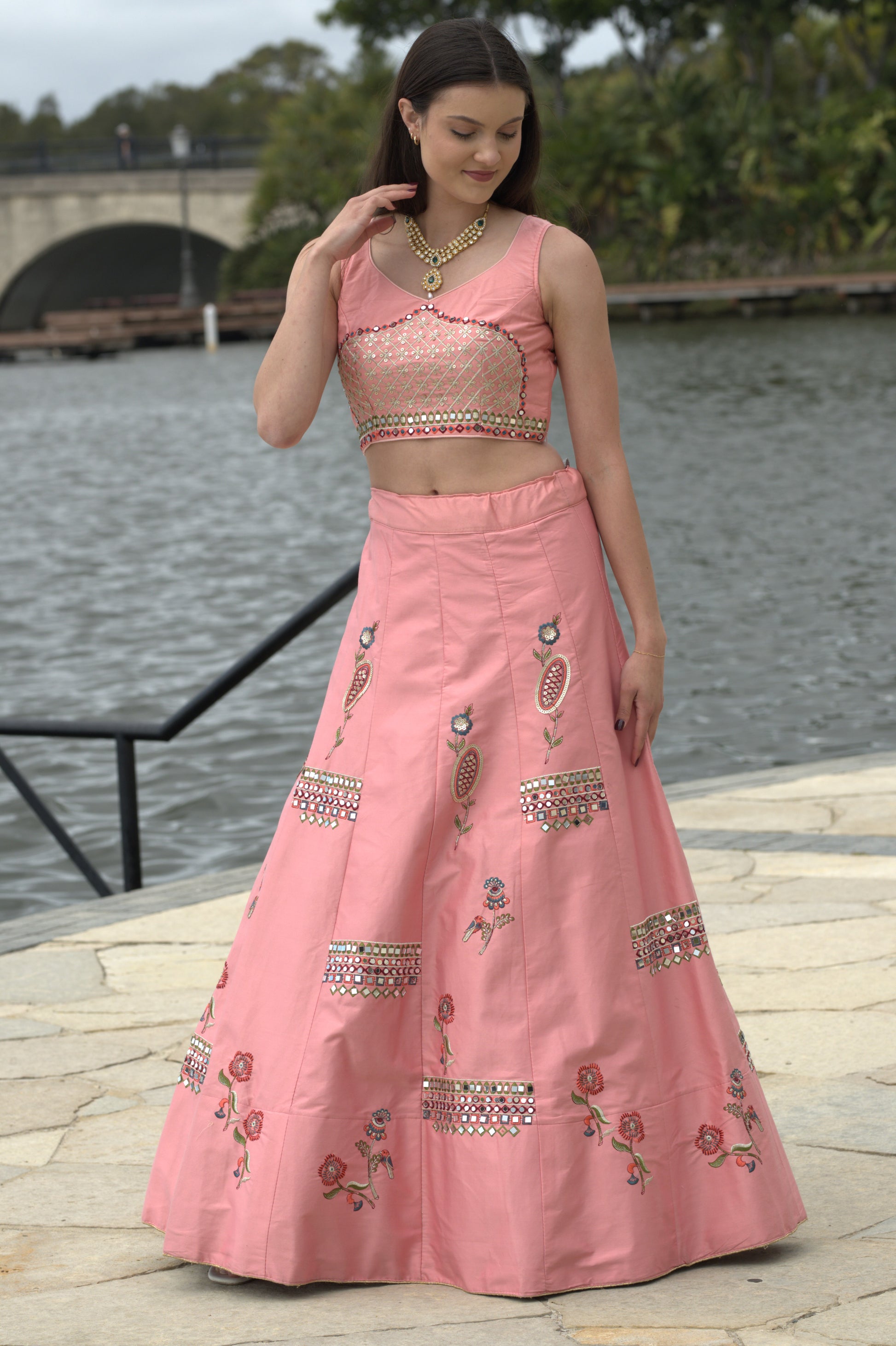 Elevate your festive look with our elegant Pink Ombre Mirror Lehenga/Skirt Set. The intricate mirror work adds a touch of style to any party or Diwali celebration. Perfect for Karwa Chauth, this stylish set will make you stand out in any crowd.