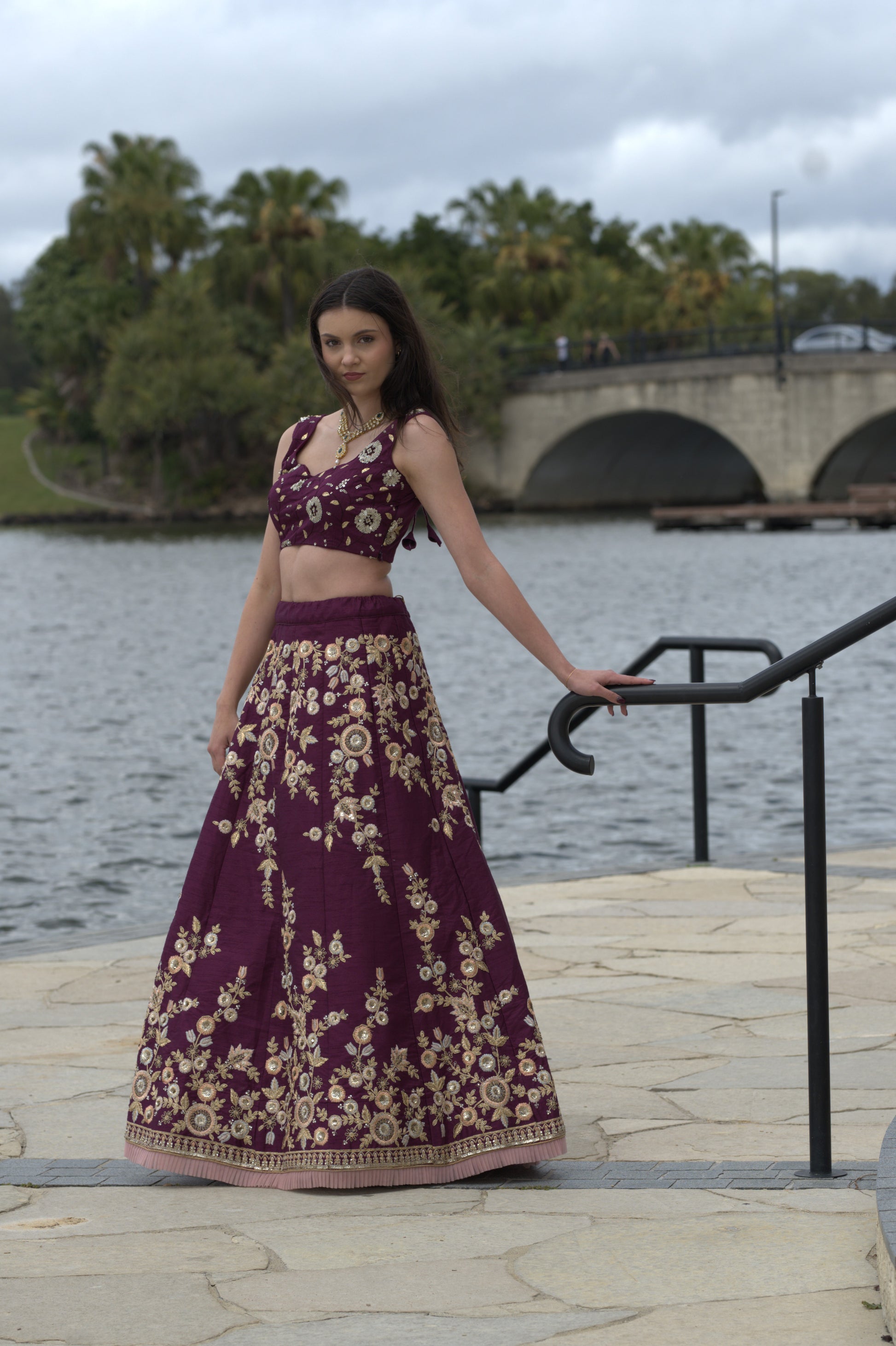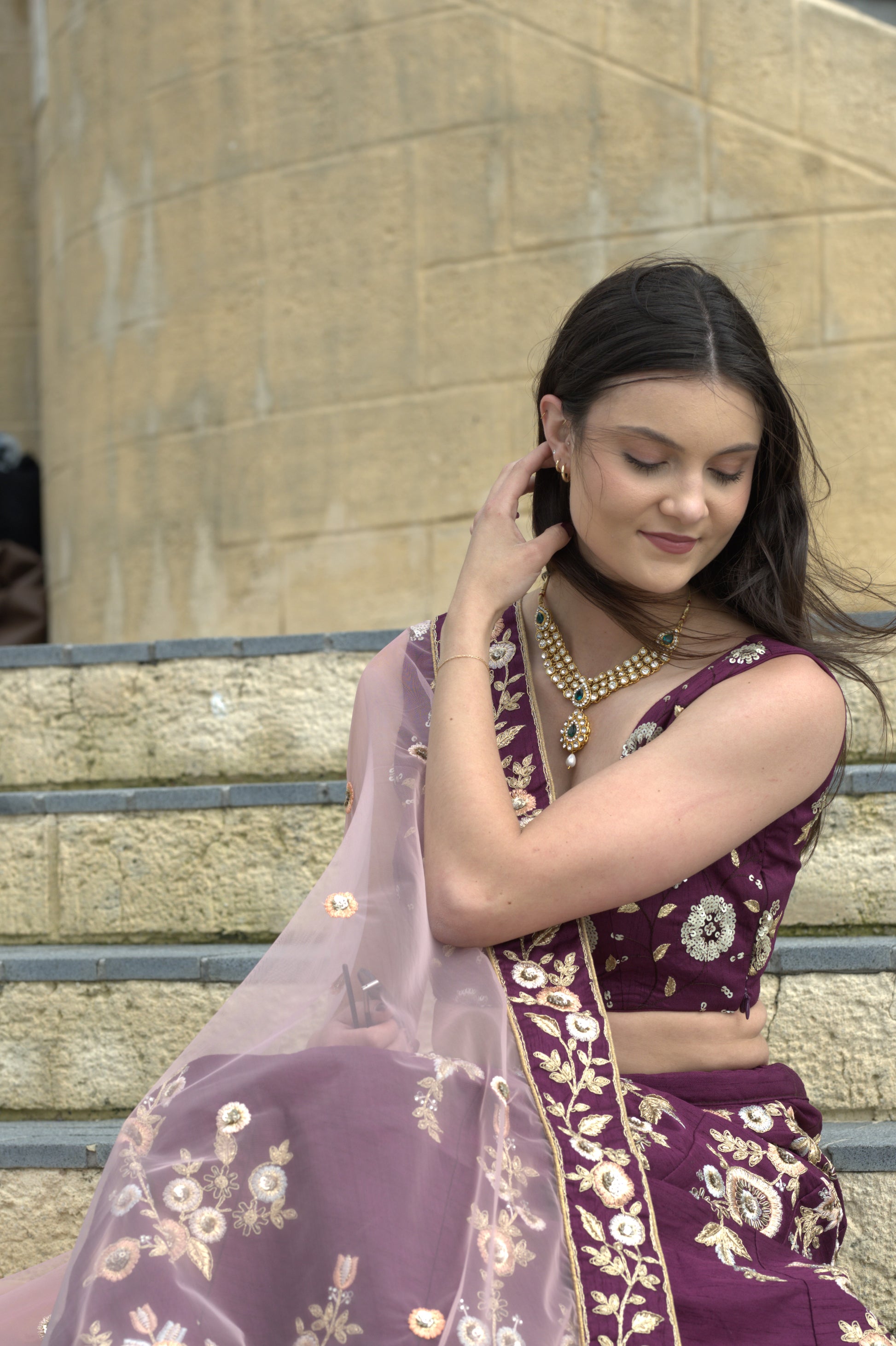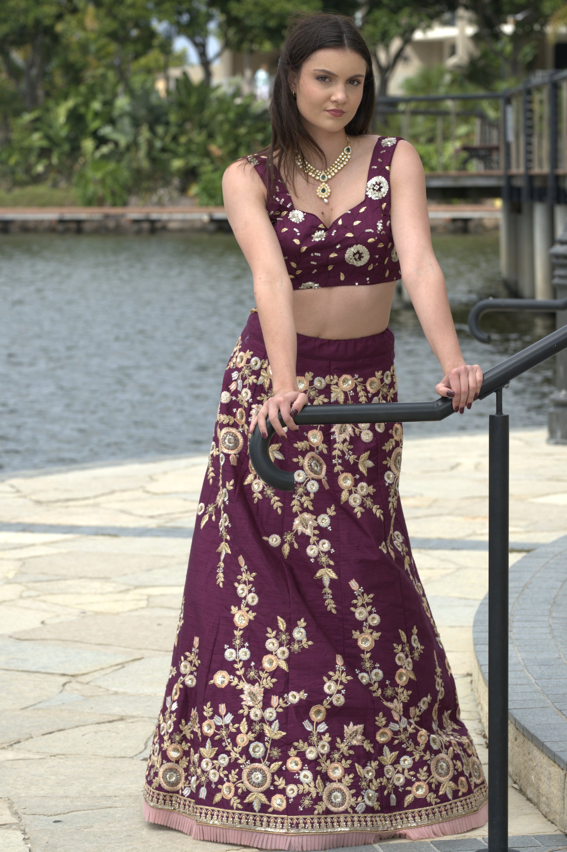 This traditional Lehenga Set features elegant Zari and Gota Patti work in bold purple and orange hues. Its stylish design and vibrant color pop make it perfect for special occasions. Add a touch of culture and sophistication to your wardrobe with this stunning piece.
