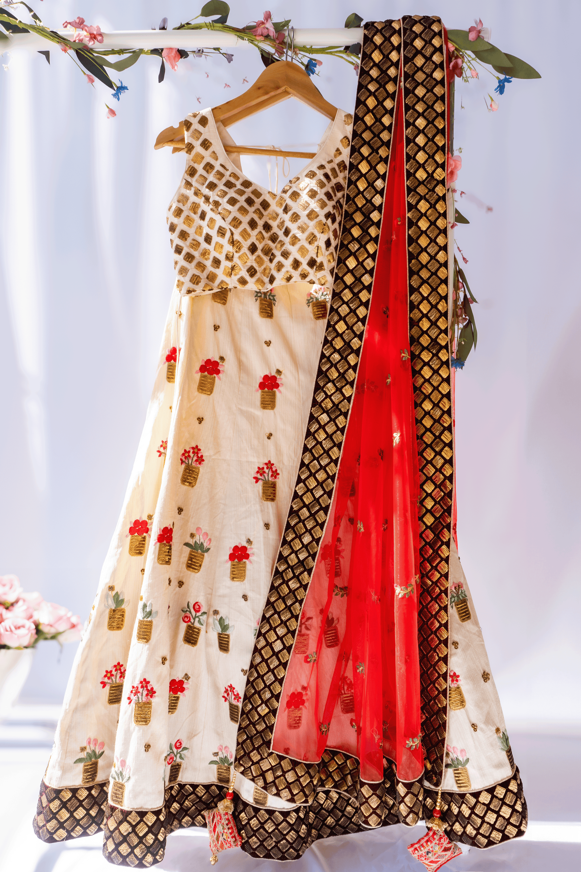Red Roses Lehenga Set - White