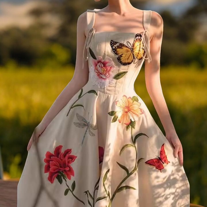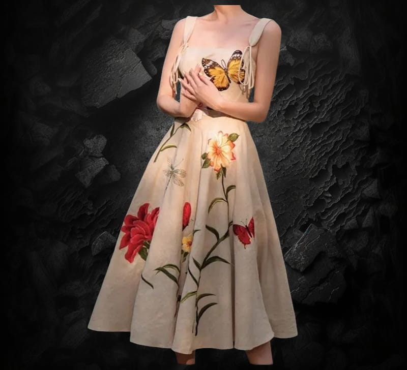 The butterfly dress is a stunning party dress that combines elegance and beauty. With intricate butterfly and flower designs in vibrant green, red, and yellow, this dress is perfect for any occasion. Its casual yet stylish look makes it suitable for both daytime and evening events.