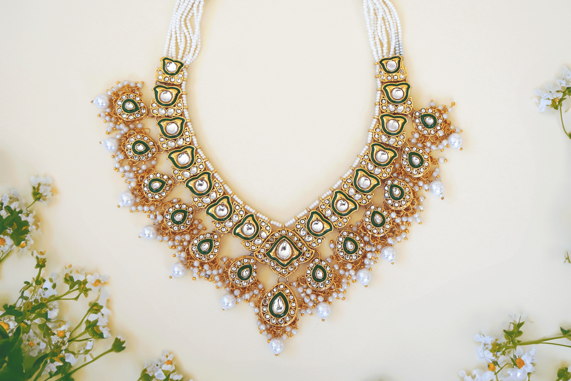 Elevate your style with this White Pearl Mirror Elegant Necklace Set with elegant Green. Featuring a unique combination of white, pearls, and mirror elements Get ready to slay with this White Pearl Mirror Elegance Necklace Set - Green! It's a perfect accessory for those who love to keep it fresh and funky. And of course, the colour green will make everyone green with envy. So go ahead and add this set to your collection ASAP (as stylishly as possible)! this set boasts a captivating design of pentagon, oval, and circular shapes with delicate Pearl Droplets. Perfect for both ethnic and party looks.